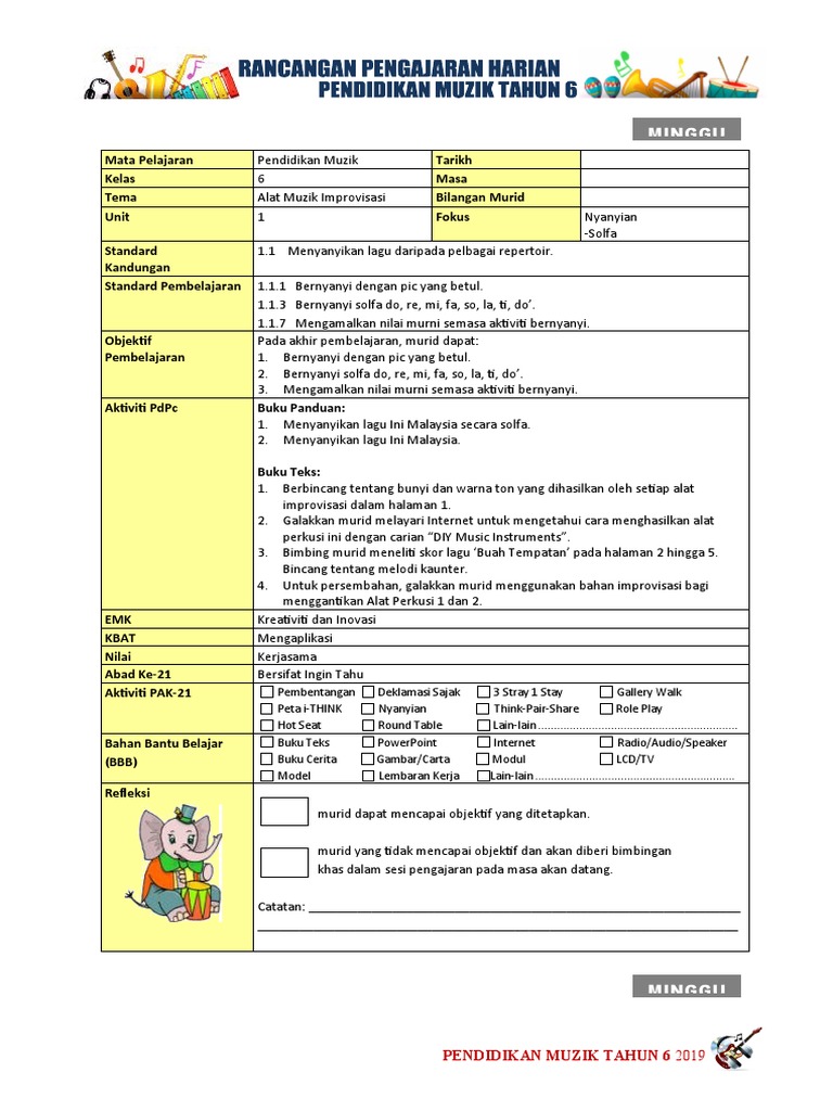 Pendidikan muzik tahun 6 apakah simbol muzik itu? Free worksheet (bi year 1,2,3,4). Mohd shahir bin hassan moe 21 february 2021. Gimnastik asas tahun 6 hambur dan pendaratan. Rph pendidikan muzik tahun 6. Rph (rancangan pengajaran harian) dunia muzik tahun 2 (1). Guru boleh pilih tarikh mengikut kesesuaian hari persekolahan. Tajuk 1 pakaian tradisional dan perhiasan dirifull description. Apeng slowcuber 23 february 2021. Rancangan harian pendidikan muzik tahun 6 2018 mohd ali bin email protected nota: Ikan yu latihan rekoder pendidikan muzik tahun 5. Pengetahuan dan kefahaman bahasa muzik irama (detik) masa :30 minit. Rph dunia muzik tahun 2 adalah rancangan pengajaran harian yang perlu disediakan lebih awal oleh guru sebelum menjalankan sesi pegajaran dan ia juga penting untuk dijadikan bahan bukti bahawa guru telah membuat perancangan rapi terlebih dahulu sebelum masuk ke dalam kelas.