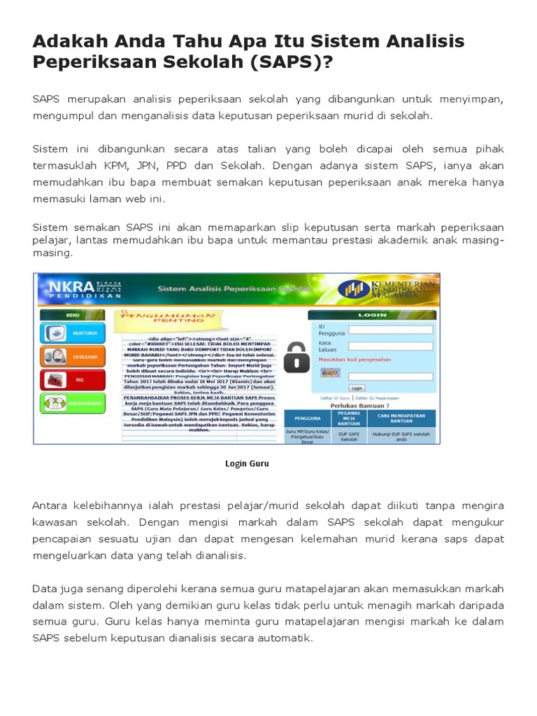 Hanya data asas akan diambil. Sistem analisis peperiksaan sekolah guru boleh dicapai melalui portal nkra semua guru mata pelajaran perlu mengisi dan mengemaskini markah dalam aplikasi saps surat arahan pengemaskinian aplikasi pengkalan data murid. Untuk mendapatkan keputusan peperiksaan terkini yang telah diupdate, sil apastikan semakan dibuat selepas markah selesai diisi. Sistem saps ini merupakan sistem yang agak baru diperkenalkan. Saps atau sistem analisis peperiksaan sekolah dirangka bagi menjalankan fungsi sebagai pusat saps. Markah keseluruhan ini dijadikan penanda aras bagi mengira peratus pencapaian, menentukan sama ada murid tersebut lulus atau gagal. Para guru mempunyai akses untuk memasukkan markah ke dalam aplikasi saps. Kerja memasukkan markah murid kedalam saps dilihat agak cerewet dan menjadi usaha beberpa kali. Semalam, ada guru yang memberitahu bahawa dia. Minggu ni pasti yang sedang bertungkus lumus memasukkan markah murid di dalam saps. Di bawah ini dikongsikan jadual dan tarikh saps guru. Analisis bukan sahaja boleh dibuat mengikut markah setiap subjek, malah guru boleh melihat data dari saps ini mampu memberikan sesuatu secara tepat dan menyeluruh untuk mengetahui tahap pencapaian seorang murid. Ramai pengguna saps mengadu kepada saya tentang masalah untuk memasukkan data serta karenah merumitkan.