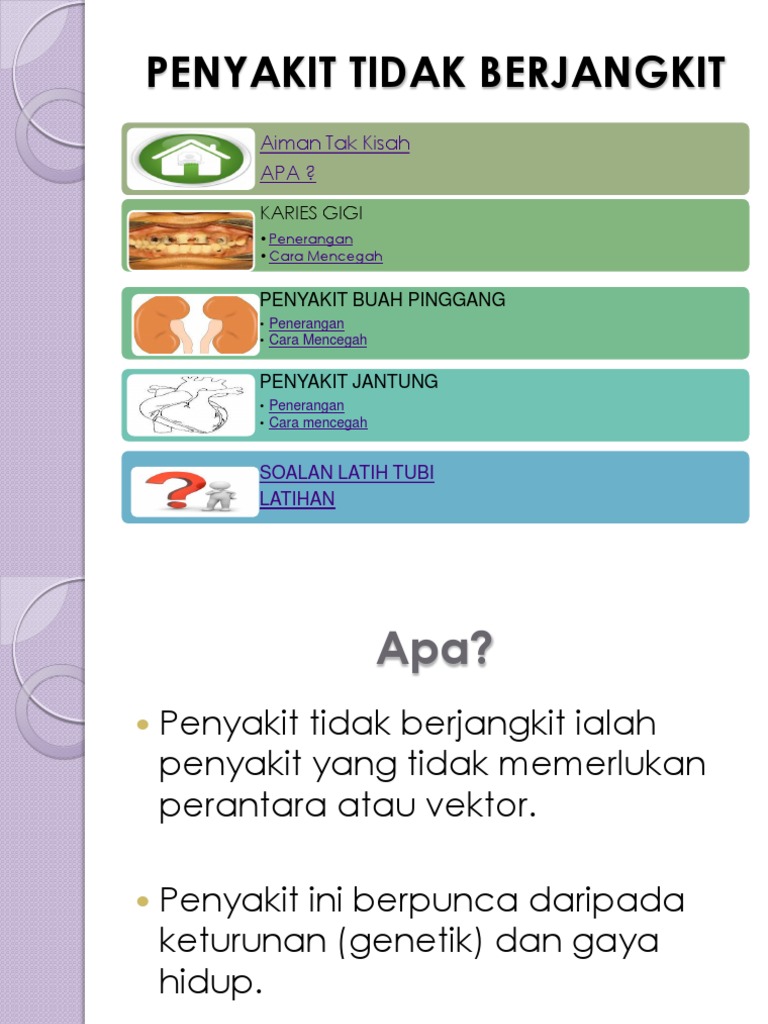 1.apakah maksud penyakit tidak berjangkit ? Definisi penyakit dan penyakit berjangkit 44. Biasanya, tanda penyakit ini muncul saat anda beristirahat atau melakukan aktivitas fisik yang berat. Penyakit berjangkit dan penyakit berjangkit adalah istilah perubatan yang mengelirukan kepada orang flu, selesema dan beberapa jangkitan virus lain adalah contoh penyakit berjangkit. Diagnosis makmal bagi penyakit tb.